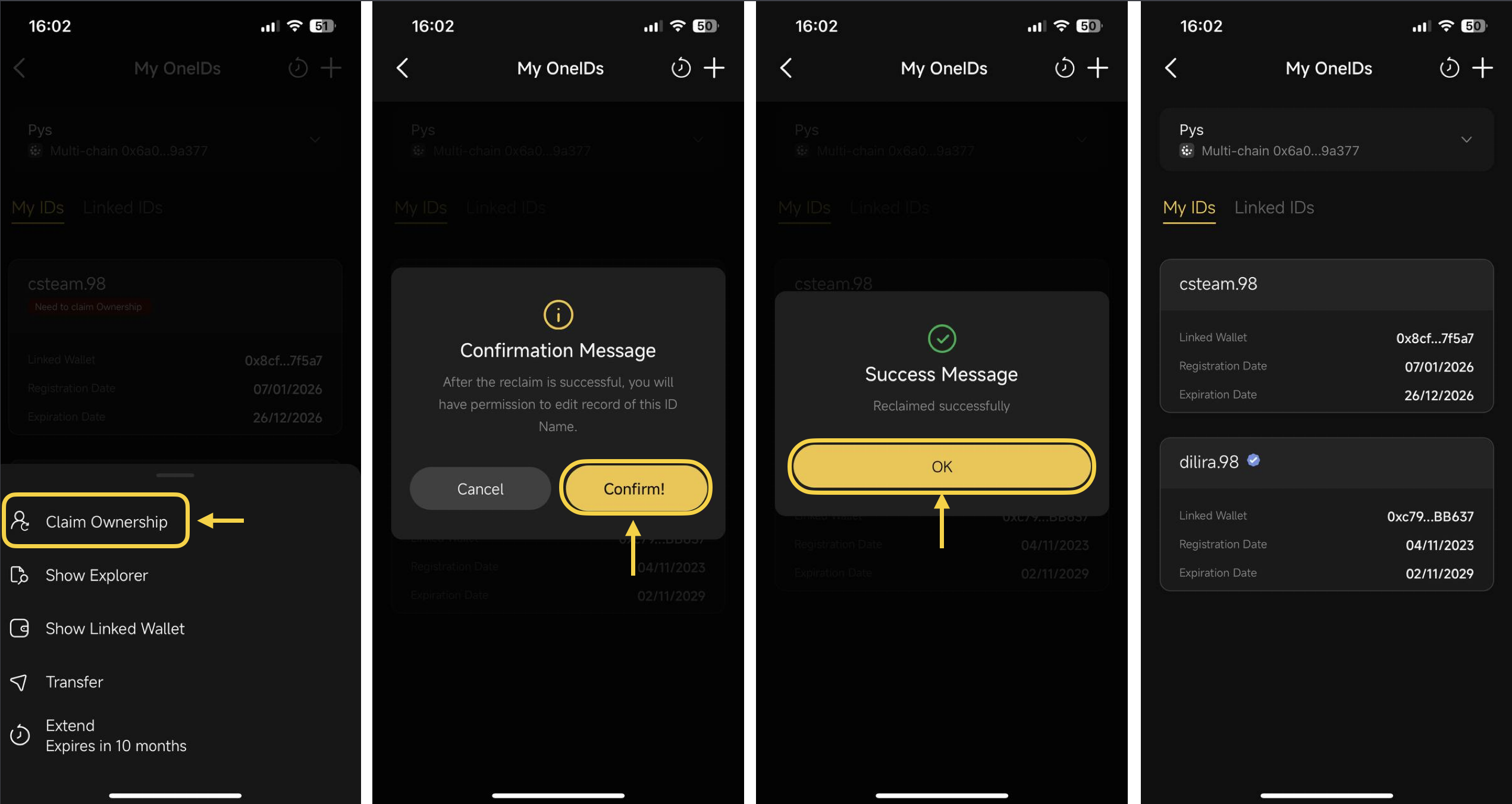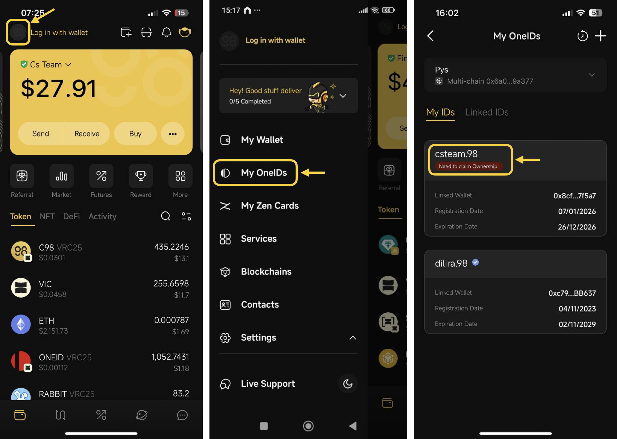 **Step 2:** Choose the wallet holding the OneID and select **My IDs** tab