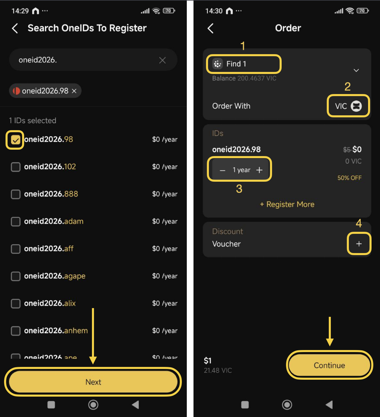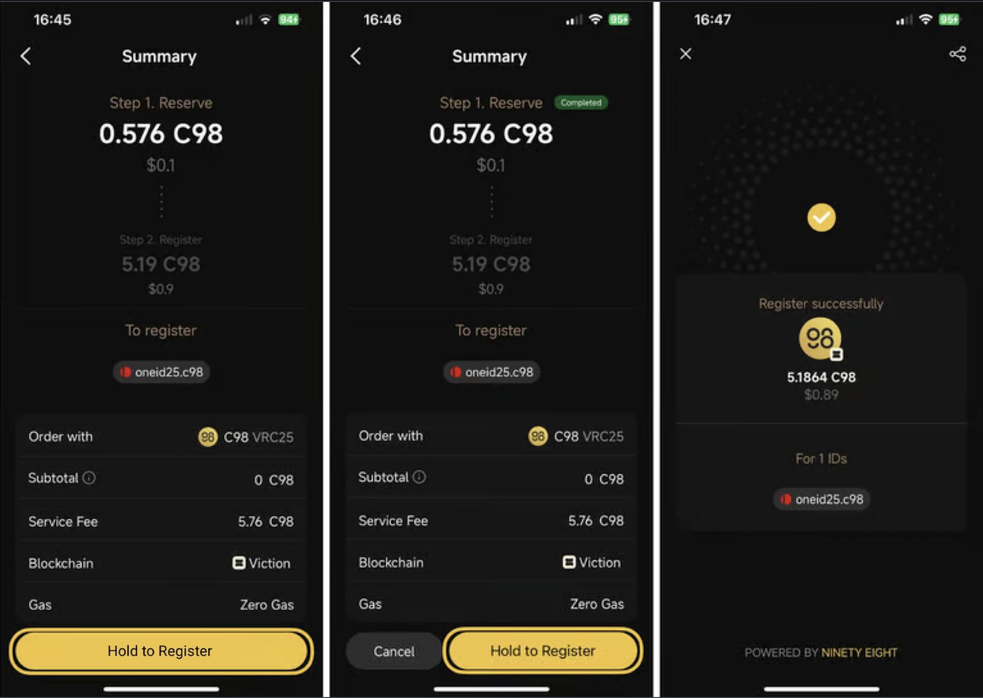 **\[2] Token to order with**: Coin98 Super Wallet now supports Multipay, which allows you to buy OneID with C98 on Viction (VRC25), BNB Smart Chain (BEP20), Ethereum (ERC20), and Polygon (PRC20). Additionally, you can use VIC on Viction. Simply, you can select your preferred token in the **Order With** section.