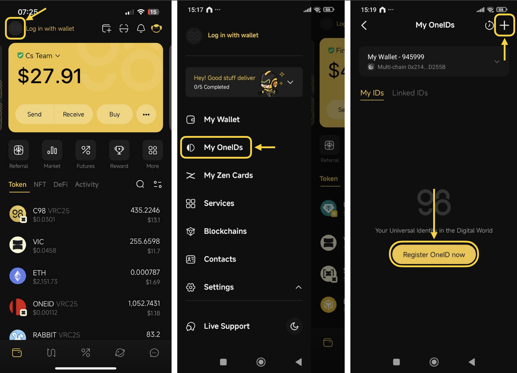 **Step 3:** Click on “+” icon at the top right corner or click **Register OneID Now**