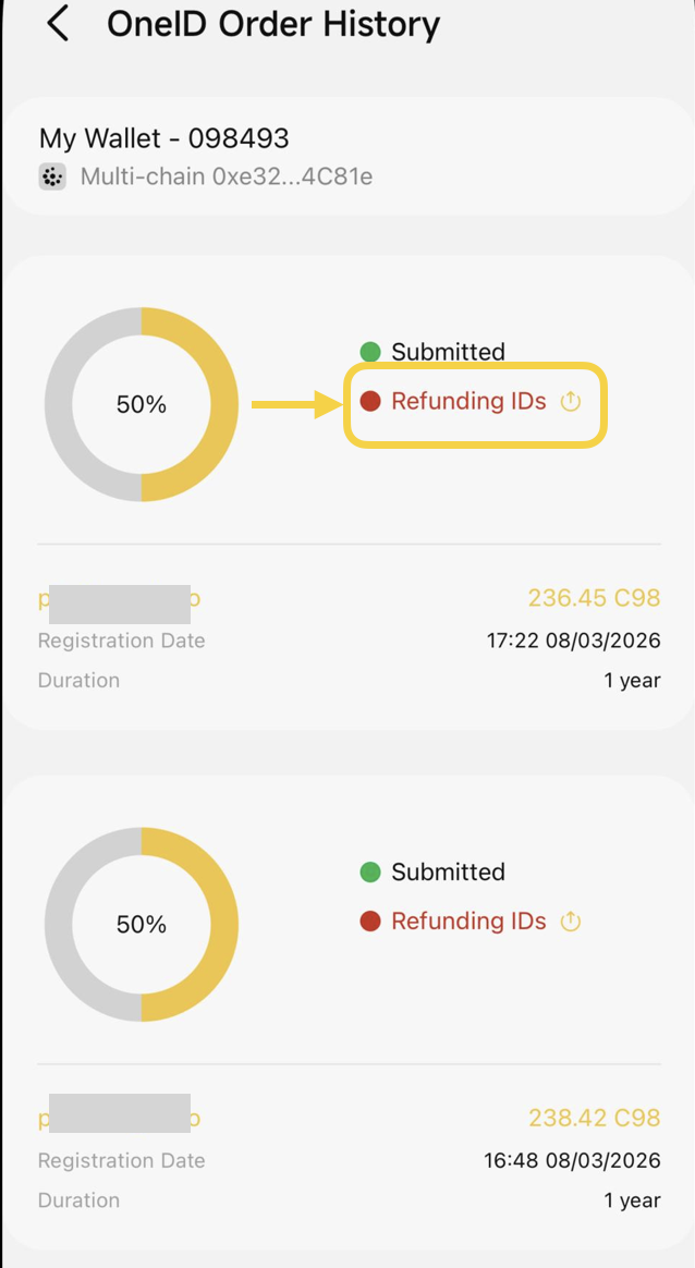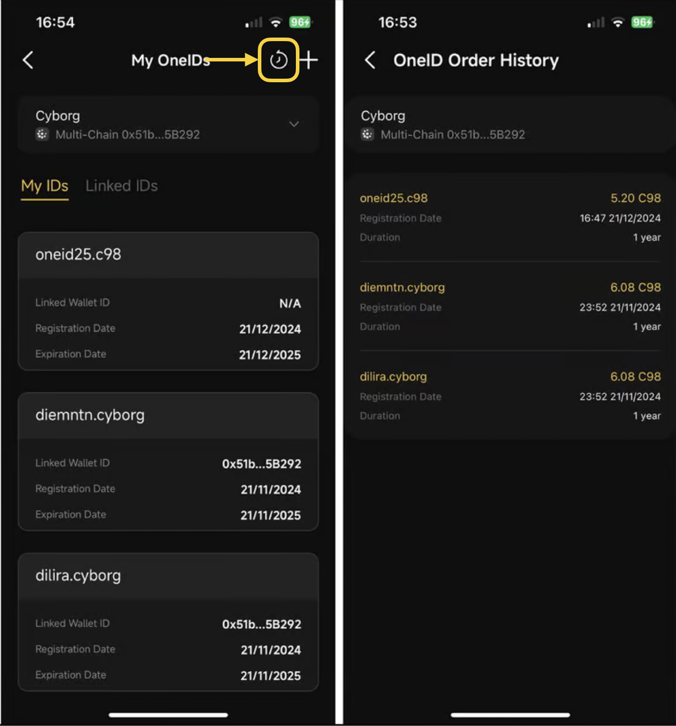After having successfully registered, you can check your ID in the My OneIDs section or the OneID Order History section.